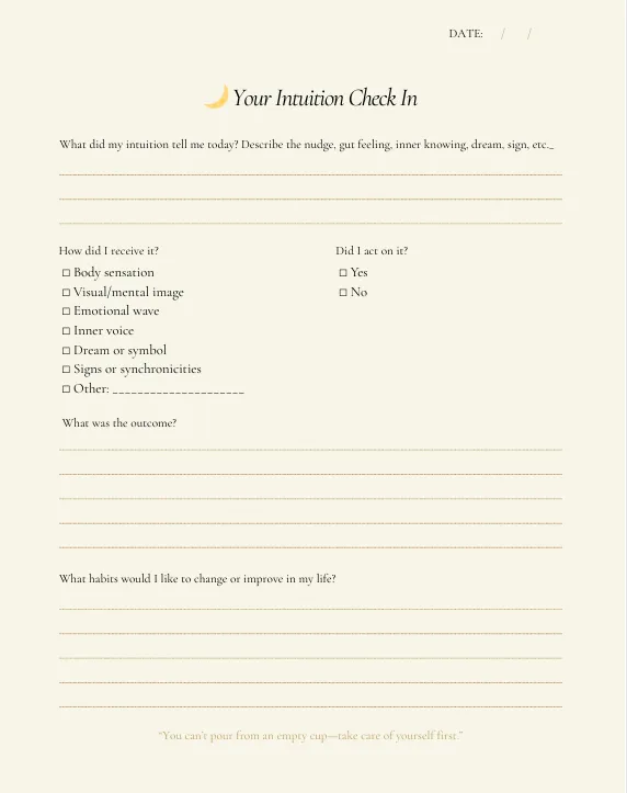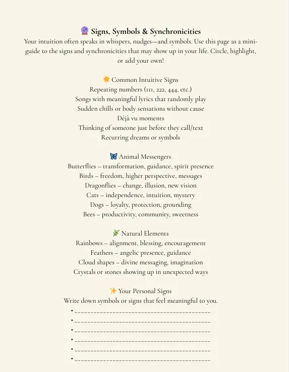 Each daily prompt invites you to record the whispers of your inner knowing — the dreams, gut feelings, or synchronicities that catch your attention.